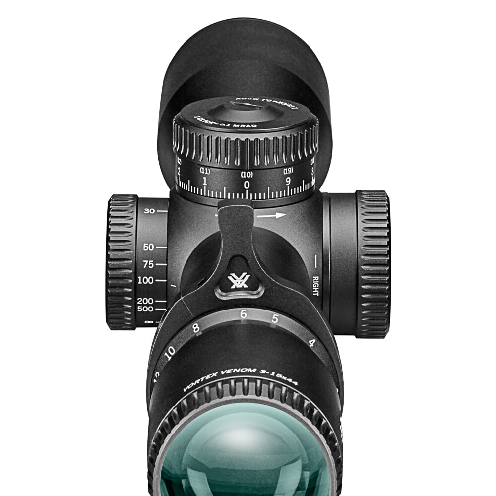 Vortex delivers a feature rich, affordable, and versatile riflescope with the Venom 3-15x44mm. It comes standard with Vortex’s renowned XD optical system with fully multi-coated lenses to enhance light transmission and reduce glare. The Venom 3-15x44mm Riflescope comes equipped with the advanced EBR-7C reticle in the first focal plane. This reticle features a precise center dot with a “Christmas Tree” pyramid of ultra-fine sub-tensions and holdover dots to compensate for bullet drop and wind drift. The Venom 3-15x44mm also features an exposed elevation turret with Vortex’s RevStop zero-stop system, allowing the shooter to return to their original zeroing after making finely tuned adjustments in the field. Additionally, the 34mm main tube provides enhanced durability and a greater range of travel.
