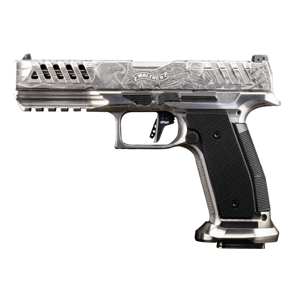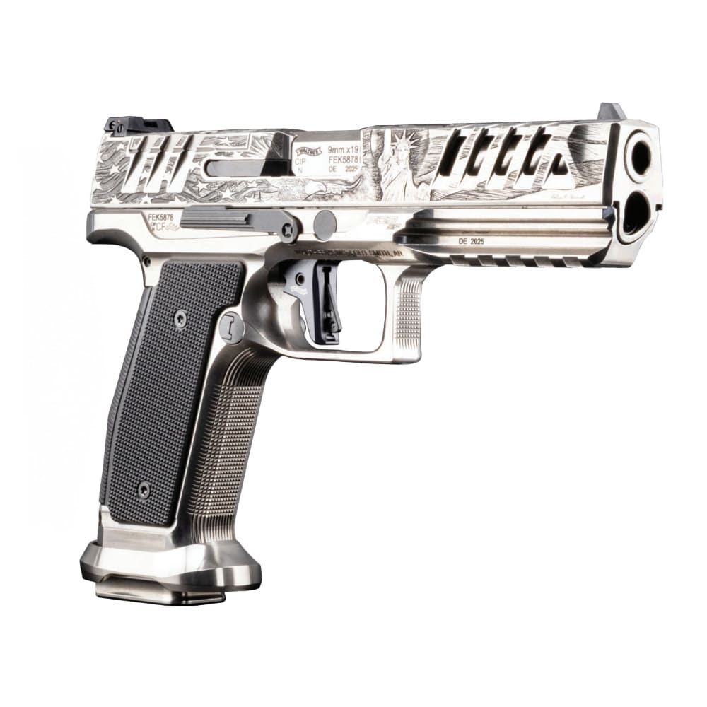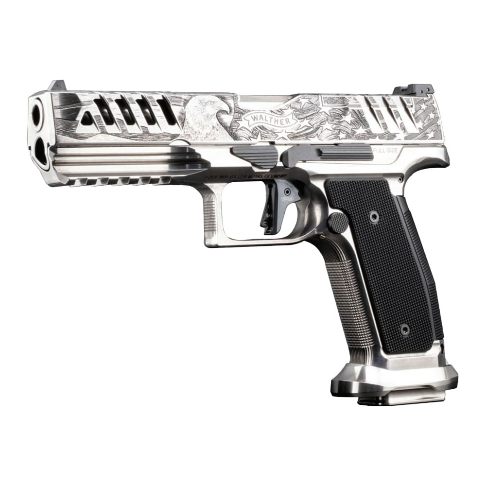 The Walther Arms Meister Manufaktur Patriot is a masterfully crafted, limited-edition 9mm semi-automatic pistol representing the pinnacle of Walther's renowned German engineering and precision manufacturing. Built on the full-size PDP platform with a premium steel frame, this match-grade pistol delivers exceptional rigidity, enhanced recoil control, and a distinctly solid feel that sets it apart from standard polymer-framed counterparts. The 5-inch barrel provides outstanding accuracy and muzzle velocity, making it equally at home on the competition stage or as a premium duty pistol. Optics-ready right out of the box, the Meister Manufaktur Patriot accommodates a wide variety of red dot sights for fast, precise target acquisition. Three 20-round Meister magazines provide generous capacity for competition and range use, while the match-grade trigger and exceptional ergonomics deliver the crisp, consistent performance that serious shooters demand. A rare and distinguished offering from Walther's elite Meister Manufaktur line, the Patriot is a collector-grade pistol that performs as impressively as it looks.