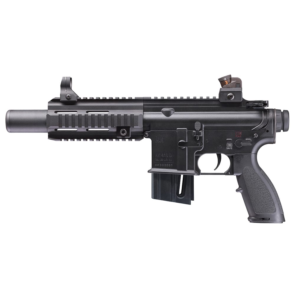 The HK 416 Pistol is based on the 416 receiver with a handgun-length barrel, short quad forend, and no buttstock. The HK 416 Pistol has a rail interface system, upper and lower metal receivers, and a bolt catch.