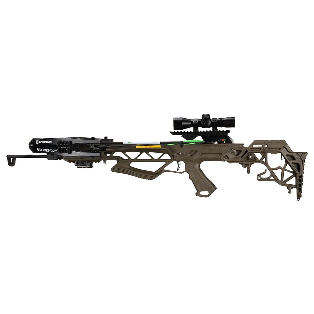 Take your hunt to the next level with the RutHunter 400X. With blistering speeds up to 400 FPS and 128 lbs. of kinetic energy, the RutHunter 400X is both fast and hard hitting. This ready to hunt crossbow comes with a 4x32 dual illuminated scope, 3 Xit-20 carbon bolts with clip on nocks, 3 bolt quiver, rope cocking device, and assembly tools.