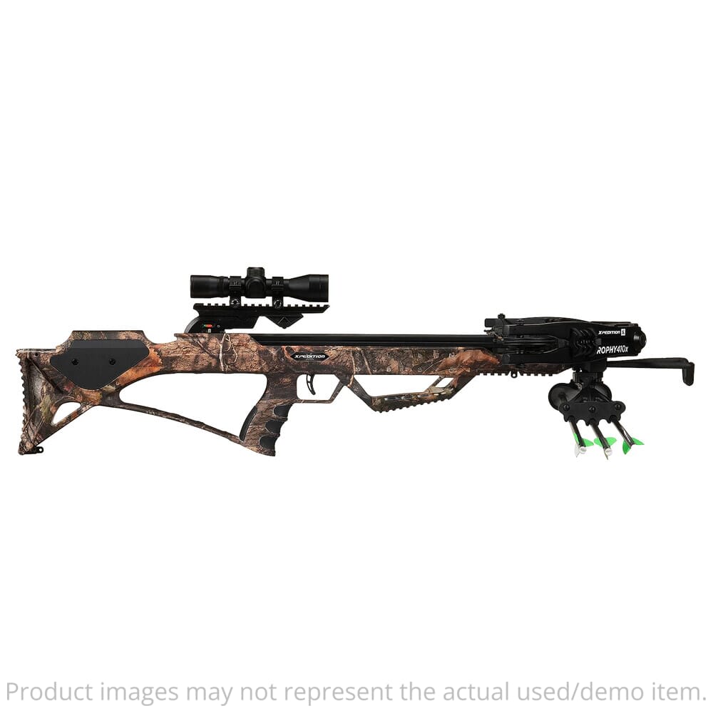 The Trophy 410X was designed for archers looking for the ultimate hunting crossbow. Shooting speeds up to 410 FPS and a Mossy Oak Country DNA camo finish, the Trophy 410X is sure to bring home your next trophy. It comes fully loaded with a 4x32 dual illuminated scope, (6) Xit-20 carbon bolts with clip on nocks, 3 bolt quiver, silent crank cocking device, rope cocking device, and assembly tools.